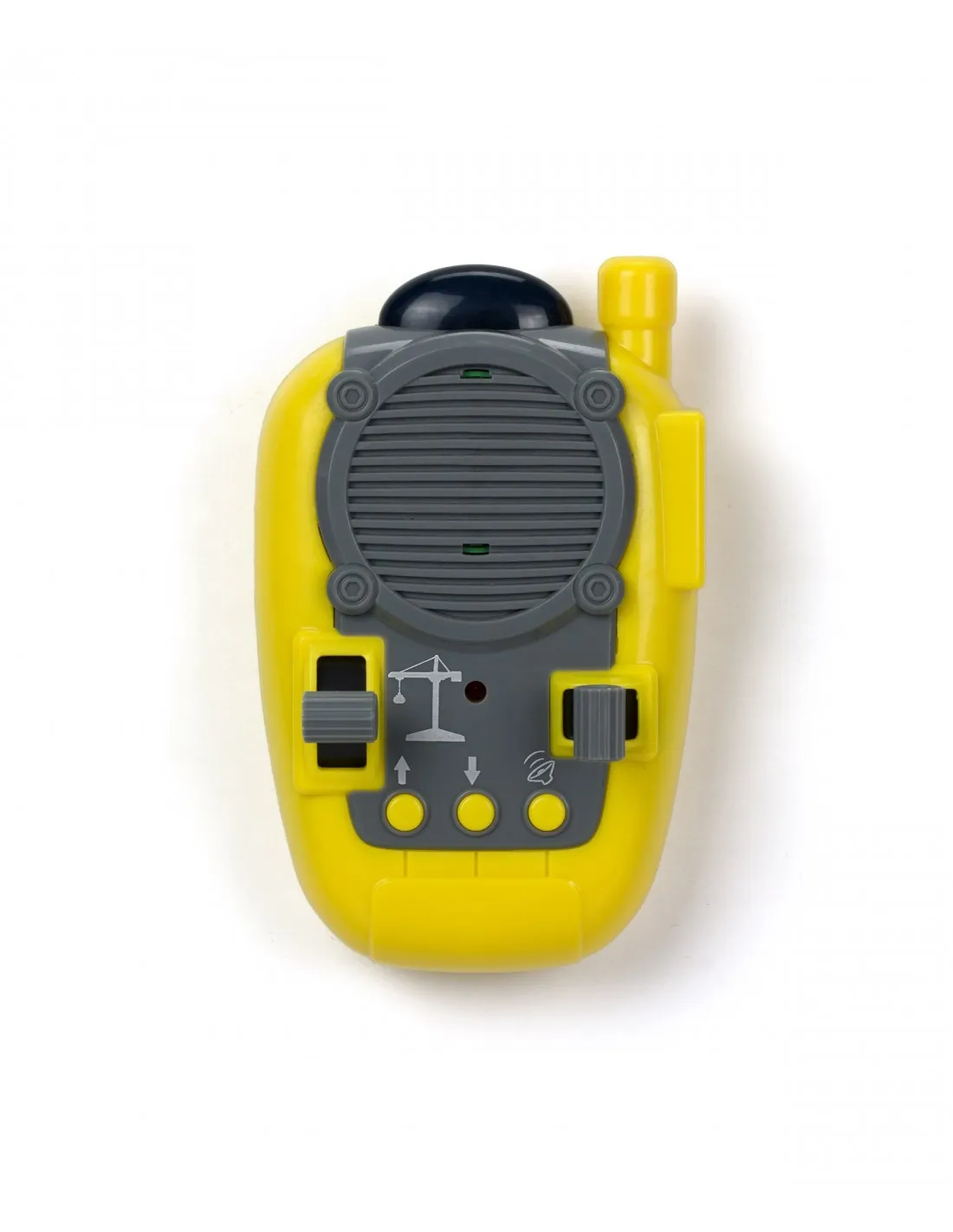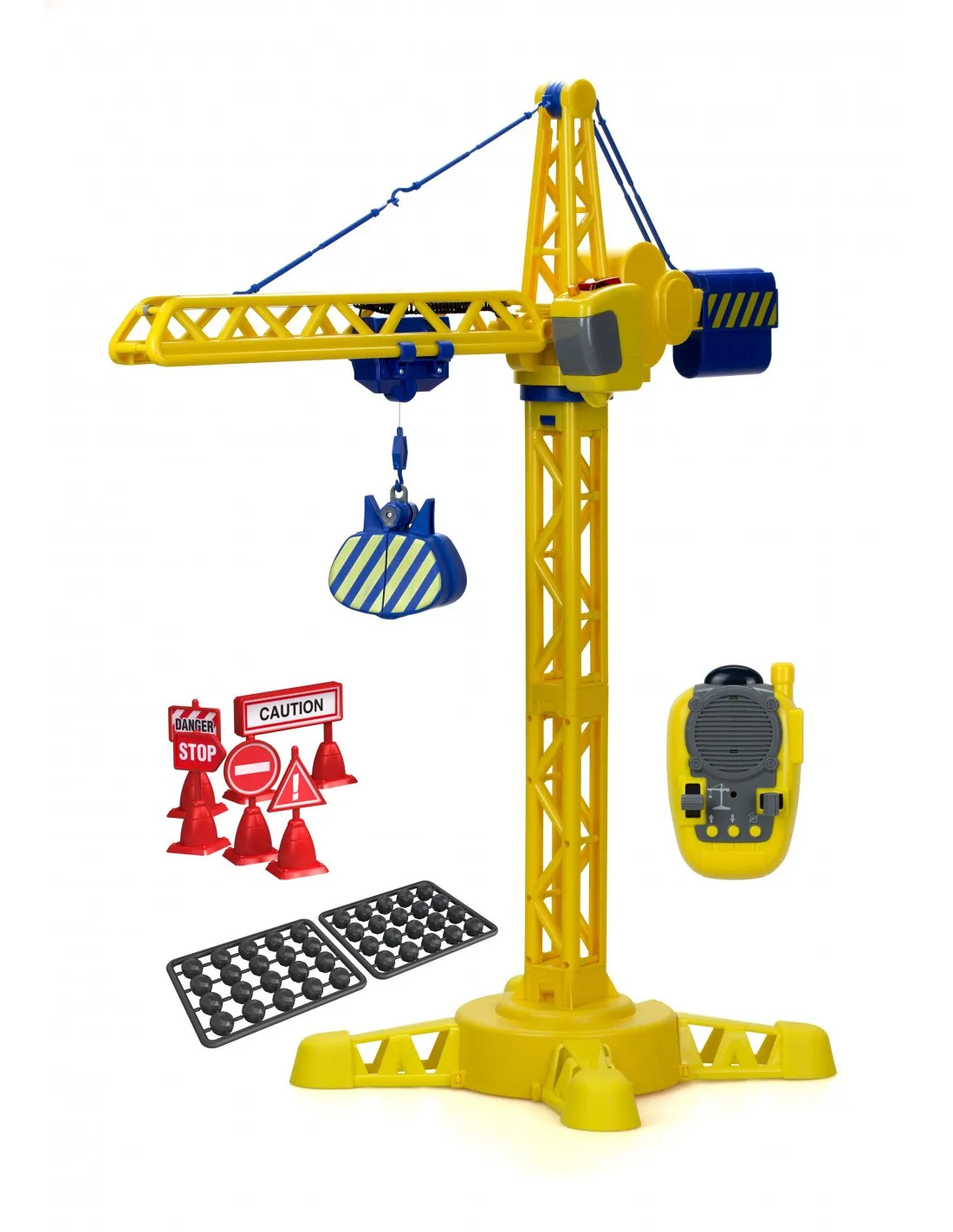 Du kontrollerar lyftkranen med hjälp av handkontrollen. Genom att trycka på de stora knapparna så får du kranen att rotera samt sänka eller höja skopan. Handkontrollen är utformad för små barns händer och det är enkelt för den lilla byggarbetaren att jobba. Tillbehör som tunnor, pallar, skyltar och koner ingår.